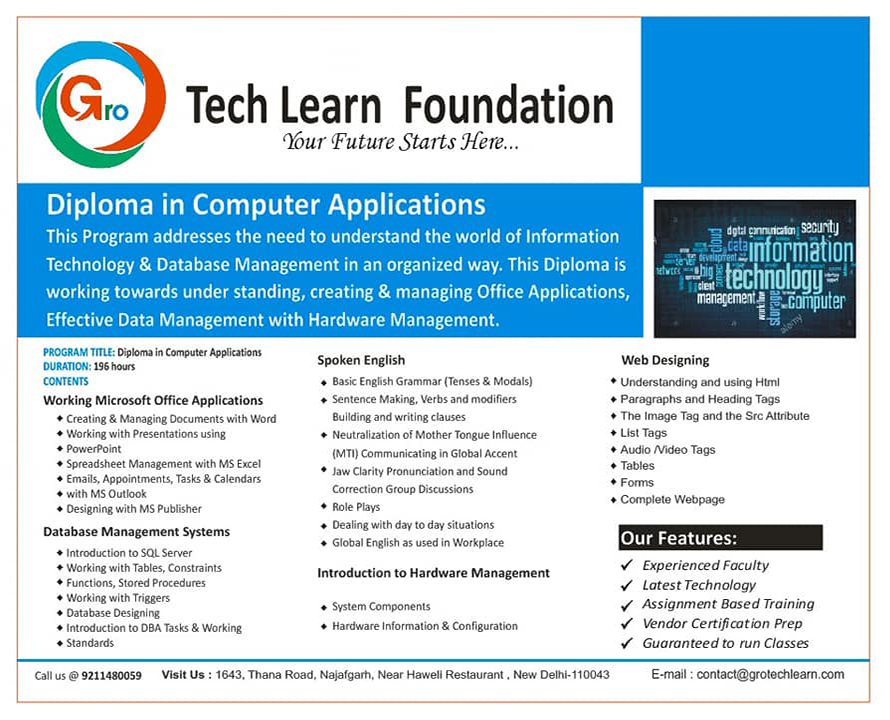 In other words, DCA computer course certificate is a great way before the unemployed youngsters (if they are at least high school pass) to seek authentic computer applications training and to get equipped with required skills, as a computer professional. In our DCA course training institute, online training is provided in a wide variety of computer courses, such as computer hardware, computer applications, Graphics Designing using Photoshop and Corel Draw, Desk Top Publishing, Basic Computer Course, Computer Hardware Course, Tally, and Advance Computer Courses.